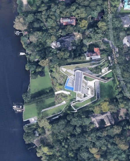 Inselstrasse 34, Berlin-Schwanenwerder Insel. To visit the island, take the S-Bahn to Nikolassee and walk. Some of the properties can be seen from the street, but most are well protected from the gaze of curious bypassers!